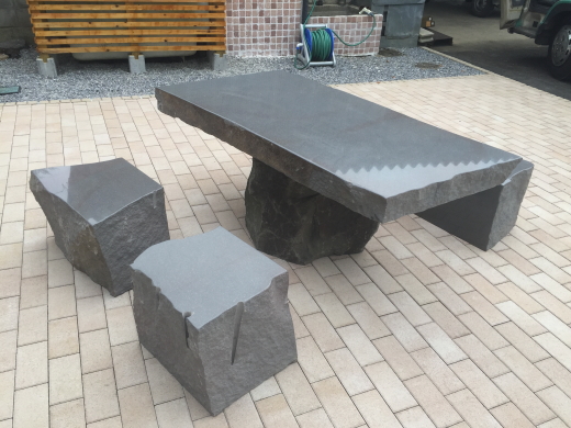 栃木県大田原市のM邸庭先に真鶴産「本小松石」のガーデンテーブルを設置しました。神奈川県産出の銘石「本小松石」の原石に磨き加工を施し、全体的なバランスとして、芸術性的と自然石の持つ独特の魅力を引き出すデザインに仕上げています。