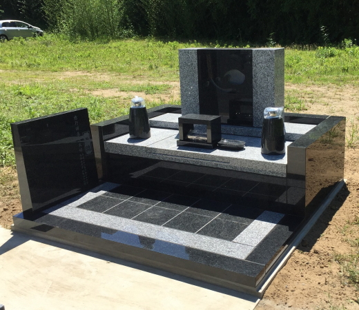茨城県稲敷郡阿見町において、アフリカ産黒御影石と稲桜石を使用したツートンカラーのデザイン墓石を建立しました。