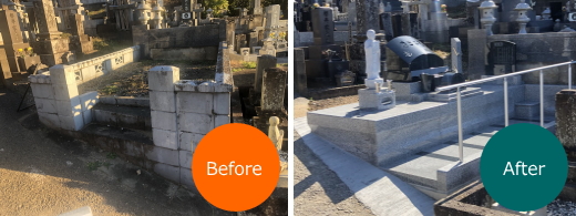 茨城県行方市において、インド緑を使用したデザイン墓石を建立しました。ブロックで区画されていた墓所をリフォームしています。外柵は、稲桜石を使用したシンプルなバリアフリータイプとし、踊り場の敷石は、インド緑と稲桜石のツートンカラーにしています。年配の方や小さなお子さんの転落防止のため、手すりも施工しました。